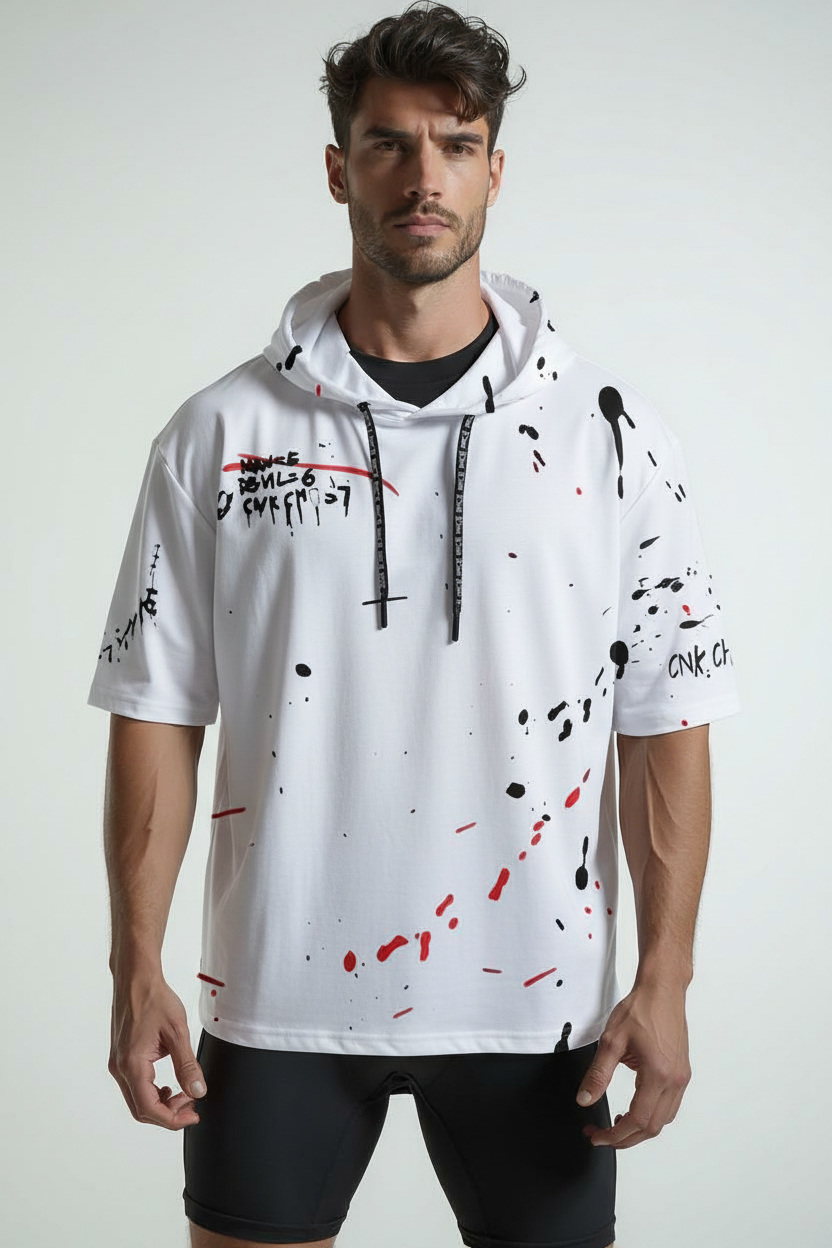 Fabric/Style: Oversized white hoodie-style T-shirt.